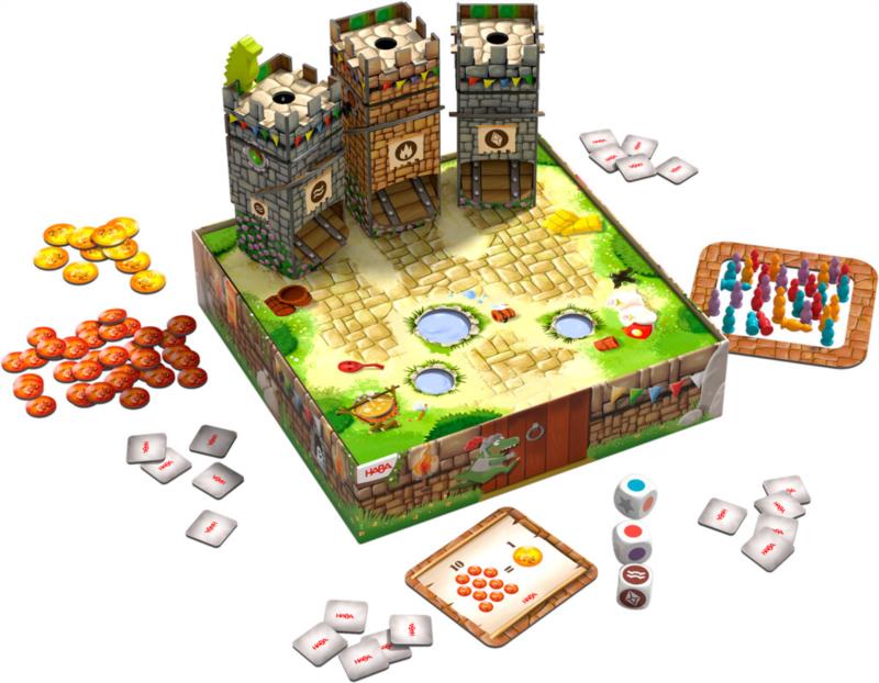 ¡El gran espectáculo de los dragones ha vuelto! Los caballeros se preparan y por turnos van entrando en la torre hasta que abra la compuerta y empiece el tumulto. Quien consiga más caballeros gana la partida. En la segunda variante del juego, se juega con 3 torres y aquí deberemos ser los más astutos/as en lograr adivinar en que torre se esconden más caballeros para así lograr acumular más de ellos. Un clásico reinventado que vuelve al catálogo de HABA.